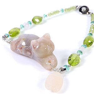 小さい方の水晶の下で揺れる 雫の形の子は、サンストーン。 そのまま、太陽パワーの石なんですの。 純粋に太陽パワーを備えたこの子は、 陰陽転換という荒業もこなす優秀な子♪ サンキャッチャーには欠かせませんわ☆