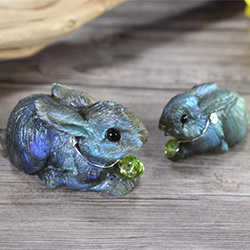 マルチカラー フローライトAA 小粒タンブル (約11×8~7×5mm)、ペリドットボタンカット (約3×4mm)、水晶A-AA ブラジル産 20面カット (約4mm)飛躍のウサギ