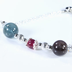 ルビー ラウンド (約6~6.5mm)、ライトニングクォーツ(花火スーパーセブン) ラウンド (約9mm)、キャッツアイ・インディゴライト (約10mm)、水晶 ボタンカット (約4mm)、silver925虎玉ブルー