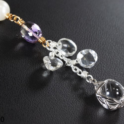 ホワイトシェル フラワー (約10mm)、ブルーサファイア ドロップブリオレットカット (約3×2mm~)、淡水真珠 ポテト (約3mm)、ブルーサファイア ボタンカット (約3×1mm~)、水晶 ラウンドカット (約4mm)、合金カテゴリ