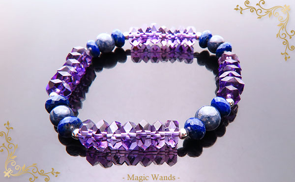 とっても綺麗で大粒のアメジストボタンをベースに、 アイオライトとサファイアをWメインに、 それらにラピスラズリが花を添えるバングルです。 豊かさの上の努力をテーマにしました。