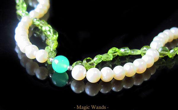 ペリドットの木の氣を生かし、 更に力を育てて伸ばす水の氣。 その水の氣のために、淡水パールを ゴージャスにふんだんに使ってみました。 これって。。ご覧になってみて下さいね。ほら。インフィニティーライン♪∞ (無限ループライン) しかもダブル!