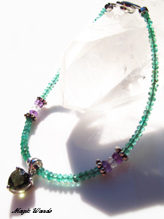 モルダバイトは、 『Celesta Parole』でもお話ししているように エンジェルカルサイトとの相乗効果が強い子です。 手首と胸元という具合に、石たちの担当配置をすることで よりメッセージや、暗示的な出来事が起きやすくなる子たち。 じっくり耳を傾けたいですわね☆