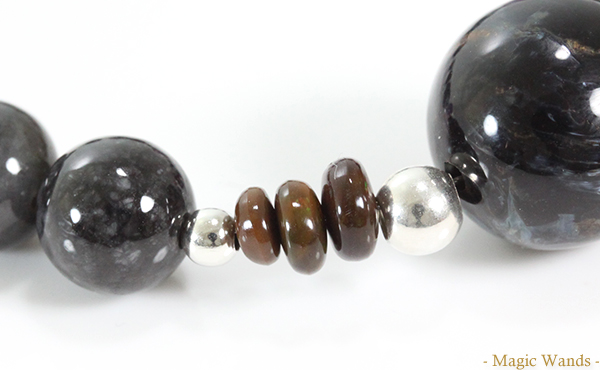 サイドに繋がる黒い石は黒翡翠。黒翡翠というのは、悪い存在に対して強烈です。 ちょっと悪ぶった魔物に、ラスボスをぶつけるようなものです。 「あんた。喧嘩は相手を見てふっかけるもんだよ。」 と静かに言いそうな性格をしていますのよ。 その破邪力の強さは、翡翠の専門卸さんが 「最も頼もしく愛おしい」とおっしゃるほどの魅力です。