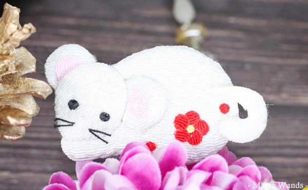 花言葉は「氣品」。 英語では「beauty and longevity(美と長寿)」 というものもあるようです。 松の枝と松ぼっくり、笹の葉もつけているので 松竹梅の一部でもあります。 ねずみくんの体にも、ちっちゃな梅の絵が描かれています。