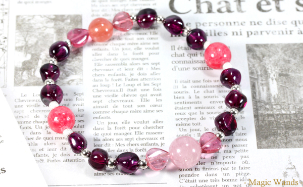 間を繋ぐベースの石はロードライトガーネット。ガーネットは天の氣と地の氣を併せ持つとされる石。 絆を深めるのに使われる子です。 ロードライトガーネットは、そんなガーネットの中でも 「薔薇」という名前を冠された特別な石。