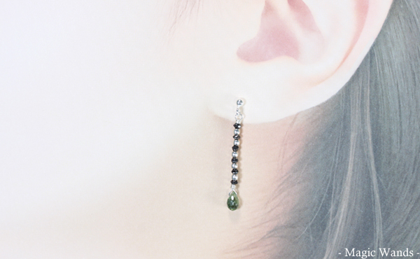 そんなグリーンサファイアを パワーブースト石であるブラックダイヤで強力に後押しして 金の氣を流れをぐぐっと作り出す。 そんなコンセプトの元にこのピアスは生まれました。