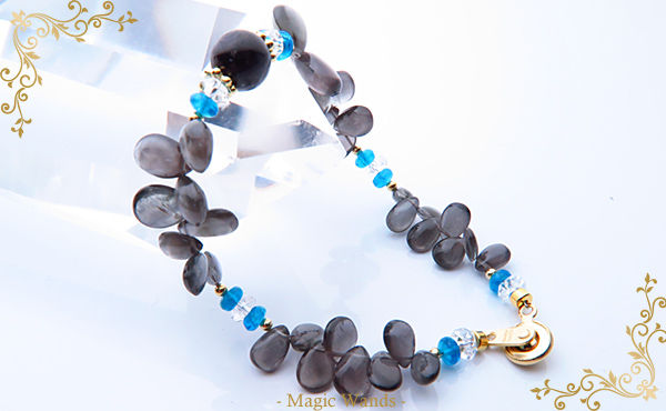 その間で彩りを添えるのが魅力アップのアパタイトです。 くっきり青く、とても綺麗な子を使いました。 この石は周囲が動揺する勢いで 魅力を引き上げると言われています。 周囲が動揺するという事は、 ある意味こちらも人智を超える勢いという事なんですね。 この子をシリマナイトキャッツアイの間に配置する事で、 持ち主の『本当に伸ばすべき魅力』に焦点を当てて引き上げる という仕組みにしています。