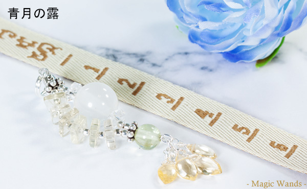 その下に滴るのは レインボームーンストーンの雫です。 レインボームーンには月の氣が宿るとされ、 月の氣をチャンスの架け橋に変える虹色シラーを持つと言われる 非常に美しい石なのであります。 透明な中からふっと浮かび上がるシラーは、 動きのない写真ではなかなか魅力を伝えにくいですね……