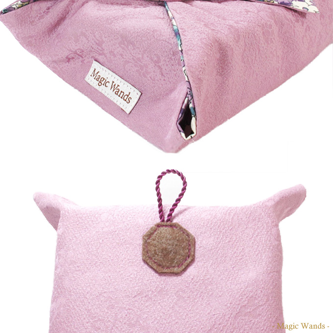普段、フックなどに引っ掛けてお使いの方もご安心ください! 引っ掛ける用にシルクのヒモも付いています! なお、このヒモの縫い付け部分には 開運モチーフの八角形をあしらっています。 スキあらば開運要素を盛り込もうとする、 手芸チームのアイディアです。