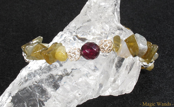 ブレスレットの中心にはガーネットを配置しました。 火と土の氣を併せ持つ石で、 豊穣を意味するとされています。