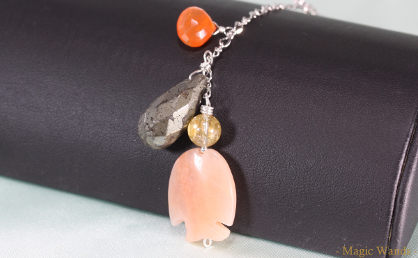 使用石が減ってはいるものの、 ・勝負に勝つためのゴールデンルチルの「エサ」 ・行動を促すためのカーネリアンの「浮き」 ・持ち主を守り育む役目のマザーオブパールの「魚」 そして全体を総括してベースを支える 水晶の重りでポイントはしっかり押さえました。 持ち歩くもよし、あかりのヒモに付けてもよし、 サンキャッチャーにもなるので窓際にさげてもよし! 美味しい魚を釣り上げてください!