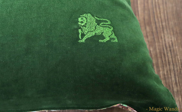 裏は全面ビロード!木の氣グリーンカラーです! 表もしっかりとした生地なのですが、ビロードは触り心地がよすぎて 手の届くところにあるとずっと撫でてしまいますね! こちらは馴染みのいいグリーンで 双獅子の刺繍を仕込んでおきました。