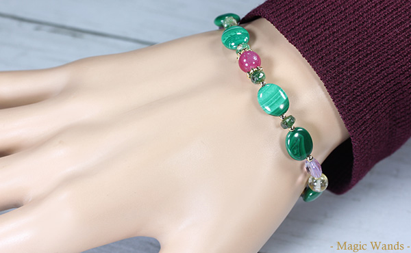 ブレスレットのベースを担っているのは マラカイトです。 マラカイトは破邪や子ども守りのパワーで よく語られていますが、じつは交渉力の面でも頼もしい石。 洞察力を引き上げるとされるパワーで しっかり話をまとめ上げます!