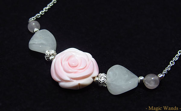 そして3つ目は、ローズクォーツ。 薔薇水晶とも呼ばれ、愛情運、恋愛運、女性運のパワーを持ちます。 女性の持つ水の氣全体のバランスを取り 停滞には活性を、不足には補充を、と働くことで 水の氣に循環を生み出し、水を清らかに保ちます。 体内の悪い運氣の出入り口でもある ネックレスの後ろのアジャスターの部分にも 見事なドロップカットが施されたローズクォーツを使っています。