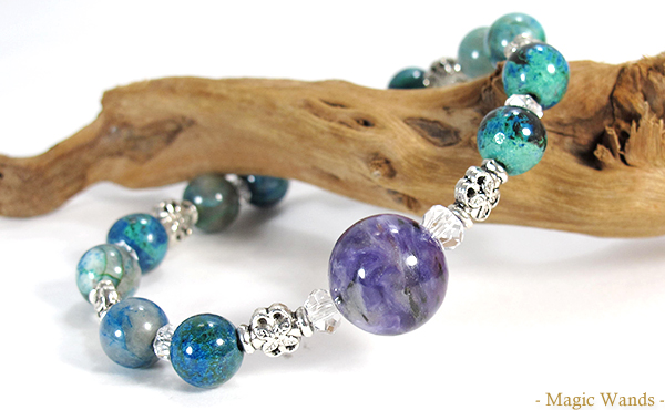 メインは、高品質のチャロアイト。 チャロアイトは、世界三大ヒーリングストーン と呼ばれている石のひとつ。 すばらしい癒しのパワーをもっています。この大きなチャロアイトがしっかりと持ち主に 癒しのパワーを供給してくれます。