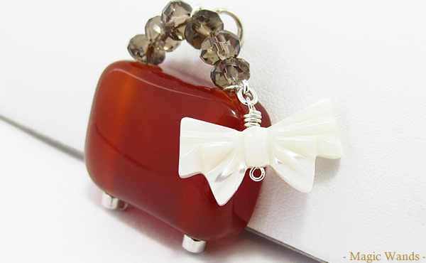 白いリボンはマザーオブパール。 真珠の生みの母の白蝶貝です。 真珠を育むように、持ち主の運氣を育んでくれます。 スモーキークォーツが定着させてくれた良い氣を、 マザーオブパールが育ててくれる仕組みです。