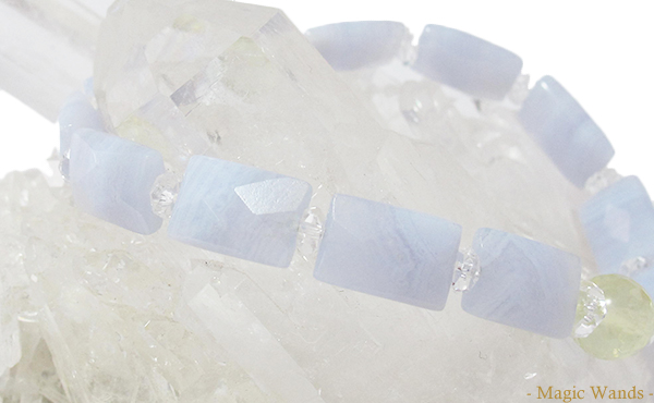 ぐるりと取り囲む春の空のような色の石は、 ブルーレースです。ブルーレースは、持ち主の優しさを引き出してくれる石。 デリケートな感性を養ってくれる石でもあります。 水の氣が足りない方におすすめです。