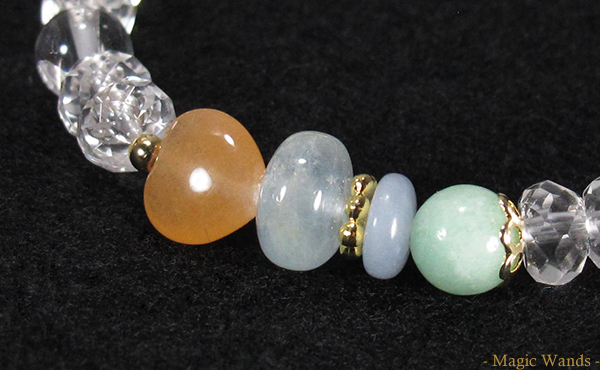 オニキスに続く石で、マットな淡い水色の石は エンジェライトです。天界との橋渡しをする石とされており、 種の成長を見守ってくれる存在です。 また、人とのコミュニケーションがあまり 得意ではない方の心強い味方にもなってくれるので、 新しい環境の人間関係づくりも難なくこなすことができます。