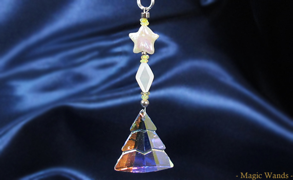 色味は光とのハーモニーを楽しむために ホワイトクリスマスカラーにまとめました。 今は霜や雪が積もっているモミの木にも、 やがては春の温かい光が降り注ぐように。 成長には欠かせない水の氣をたっぷり含んだ チャームとなりました。