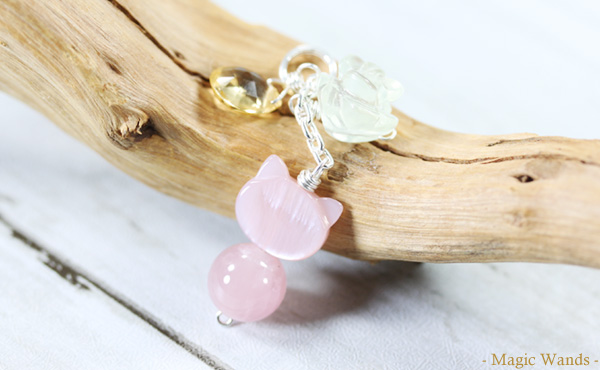 ころにゃんの顔はピンク色のマザーオブパール、 体はディープローズクォーツです。 マザーオブパールは、真珠を育て上げるお母さん貝。 ディープローズクォーツは、いちごの果汁のような 濃いピンク色がチャームポイントの石です。 ねこの毛並みのような白っぽい模様があることもあります。
