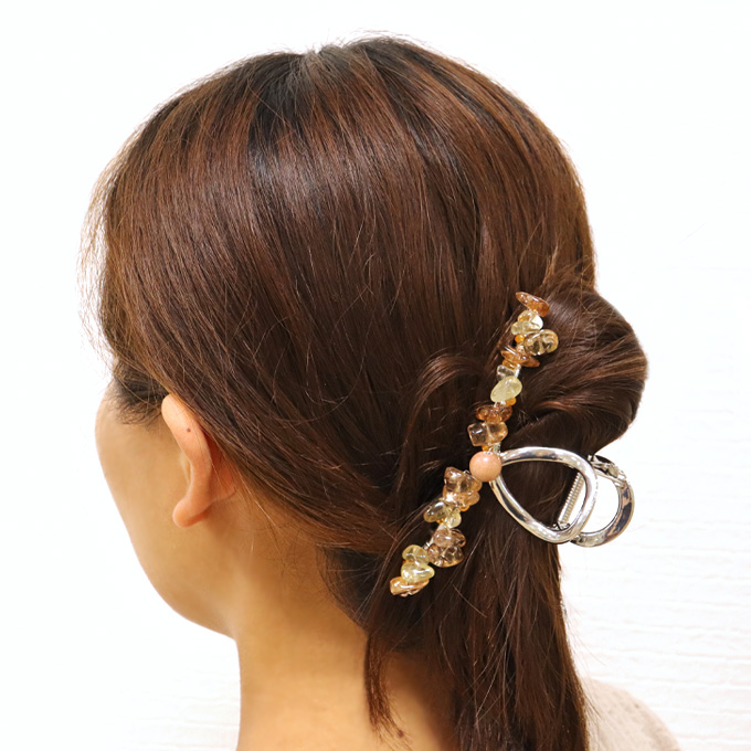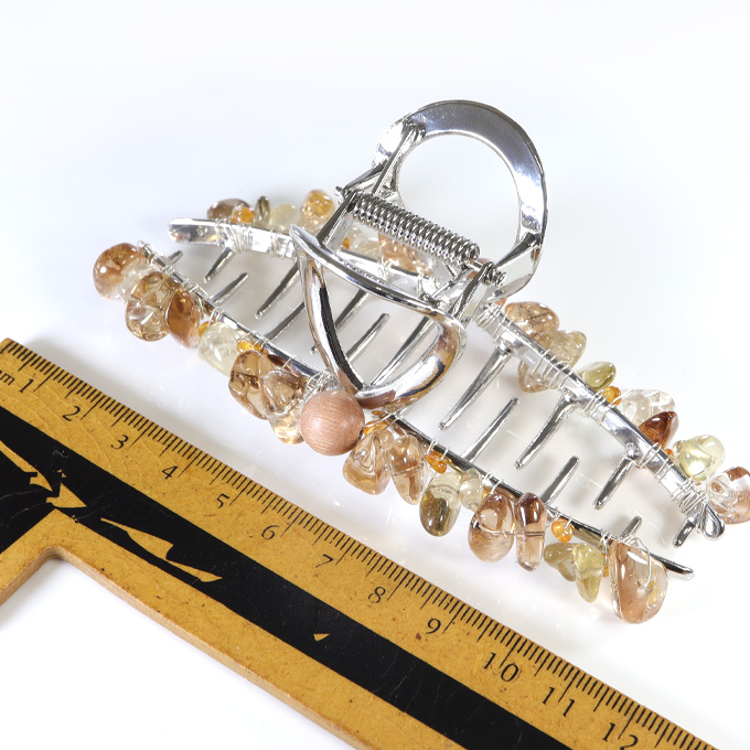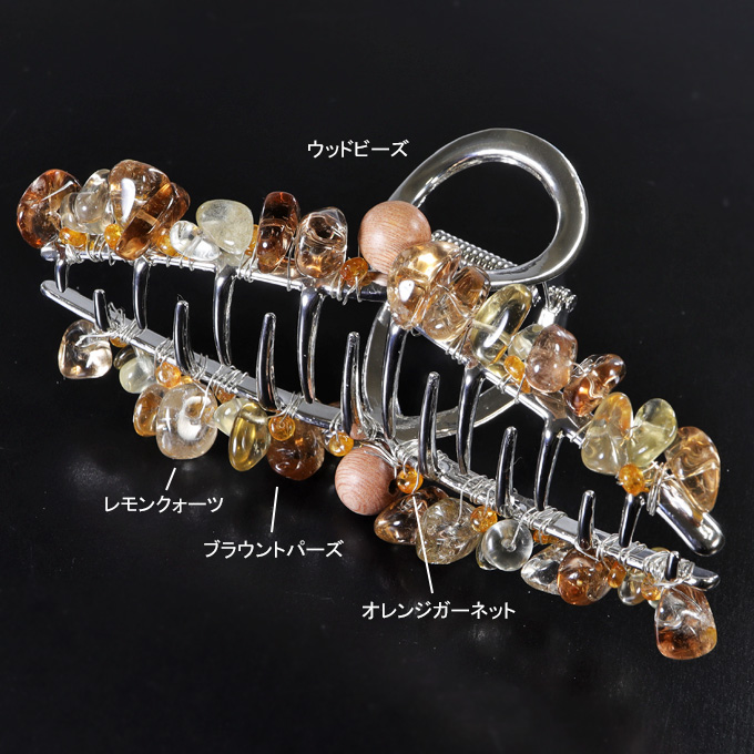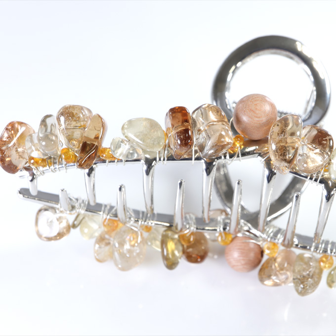 天然石×ヘアアクセサリーの組み合わせに 新しい仲間が登場しました。 バンスクリップです! 怪獣の口のように、ギザギザの歯が上下に付いているヘアクリップで ぱくりと開いて、髪を挟んで使います。 いちばん長いところが10cm以上あるサイズですので、 かなり大ぶりなクリップです。