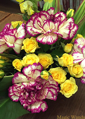 大振りのカーネーションがドラセナをアクセントにしつつ
